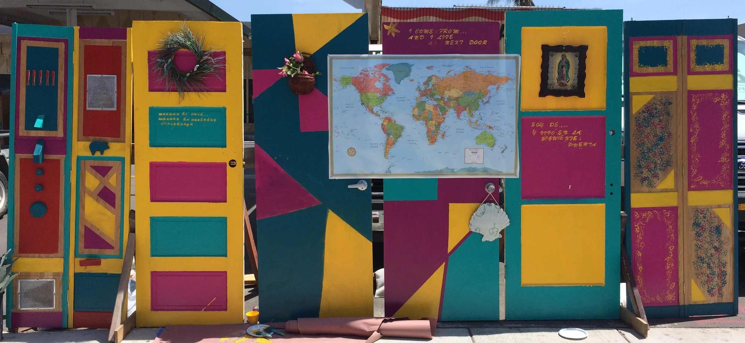 I recently volunteered for ACT- The Boulevard, a pop up placemaking event in City Heights, creating and facilitating an interactive art piece. The idea to put up painted doors on the sidewalk was originally spurred by organizers as a way to hide a line of U-Haul trucks parked right up against a well traveled sidewalk. However, it became so much more. I was asked to take the lead on this project and quickly started brainstorming with the others how this space through art could lead to greater human connection. We came up with the interactive art piece that prompted the people passing by and getting off the bus at the adjacent bus stop to engage with the piece and one another with the statement "I come from...and I live next door" in different languages. We placed a map of the world and handed people dot stickers to place on the map.